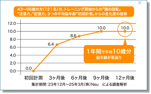 認知機能測定によってトレーニング効果を“脳年齢”として確認でき、楽しみながら脳の健康維持に取り組めます。